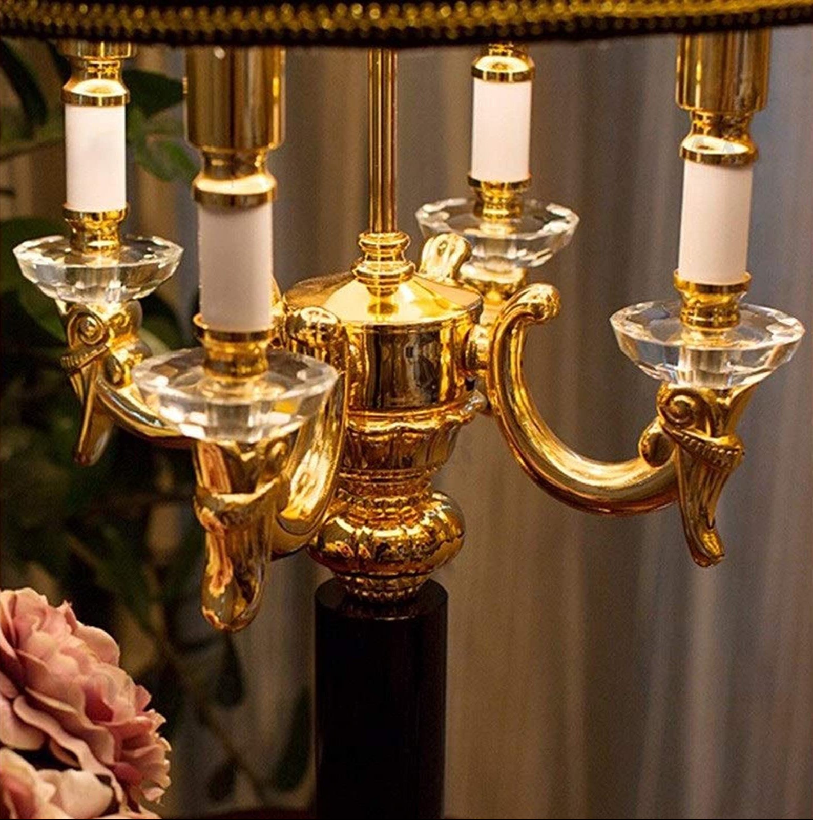 Sänglampan har en svart tygskärm och guldfärgade detaljer i foten. Den sprider ett dämpat ljus som gör den lämplig för både sovrum och vardagsrum. Lampan blir en framträdande del av inredningen.
