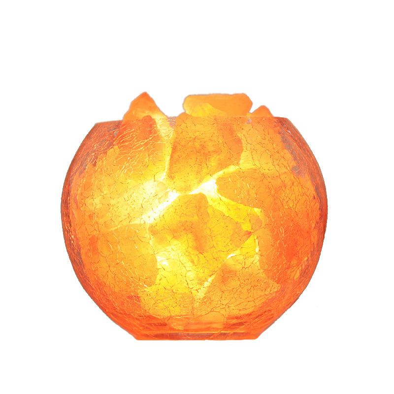 Saltlampan har en rund dekorativ skål som är fylld med saltstenar i varma nyanser. När lampan tänds sprids ljuset mellan stenarna och reflekteras i glaset vilket ger rummet en behaglig atmosfär. Den passar på sängbord, sidobord eller i vardagsrummet och blir både en ljuskälla och en detalj som lyfter inredningen.