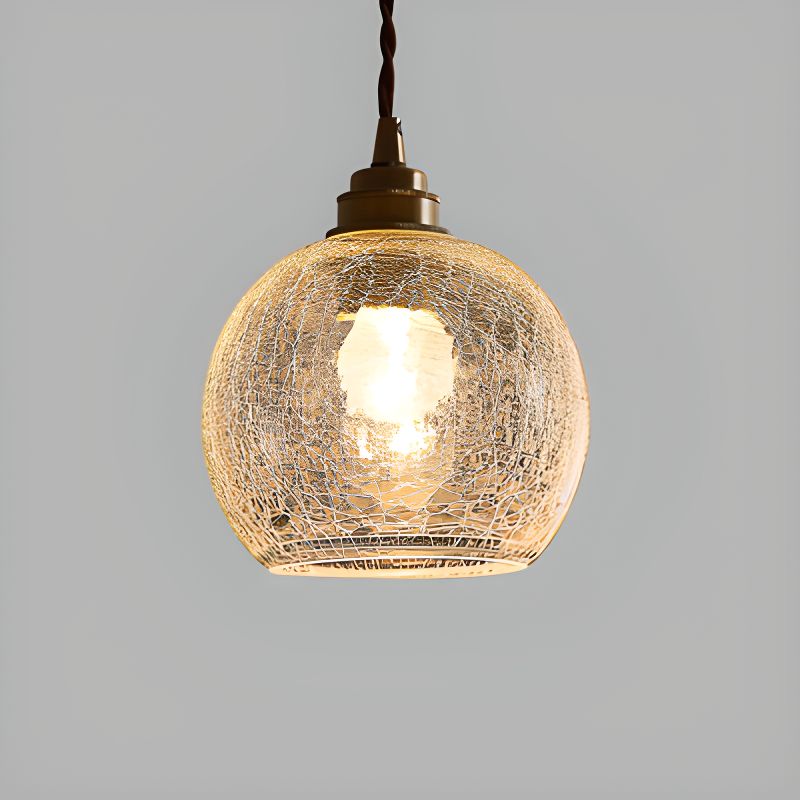 Denna taklampa har en rund glaskupa med sprucket mönster som ger ett dekorativt ljusspel. När lampan tänds sprider glaset ett varmt sken som skapar en trivsam känsla i rummet. Lampan passar över matbordet, i vardagsrummet eller i hallen och fungerar både som belysning och inredningsdetalj.